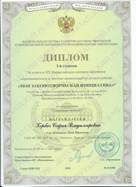 | Образование | Высшее | Окончание | 2025 год | Учебное заведение | Ленинградский государственный университет имени А.С. Пушкина | Специальность | Юриспруденция |